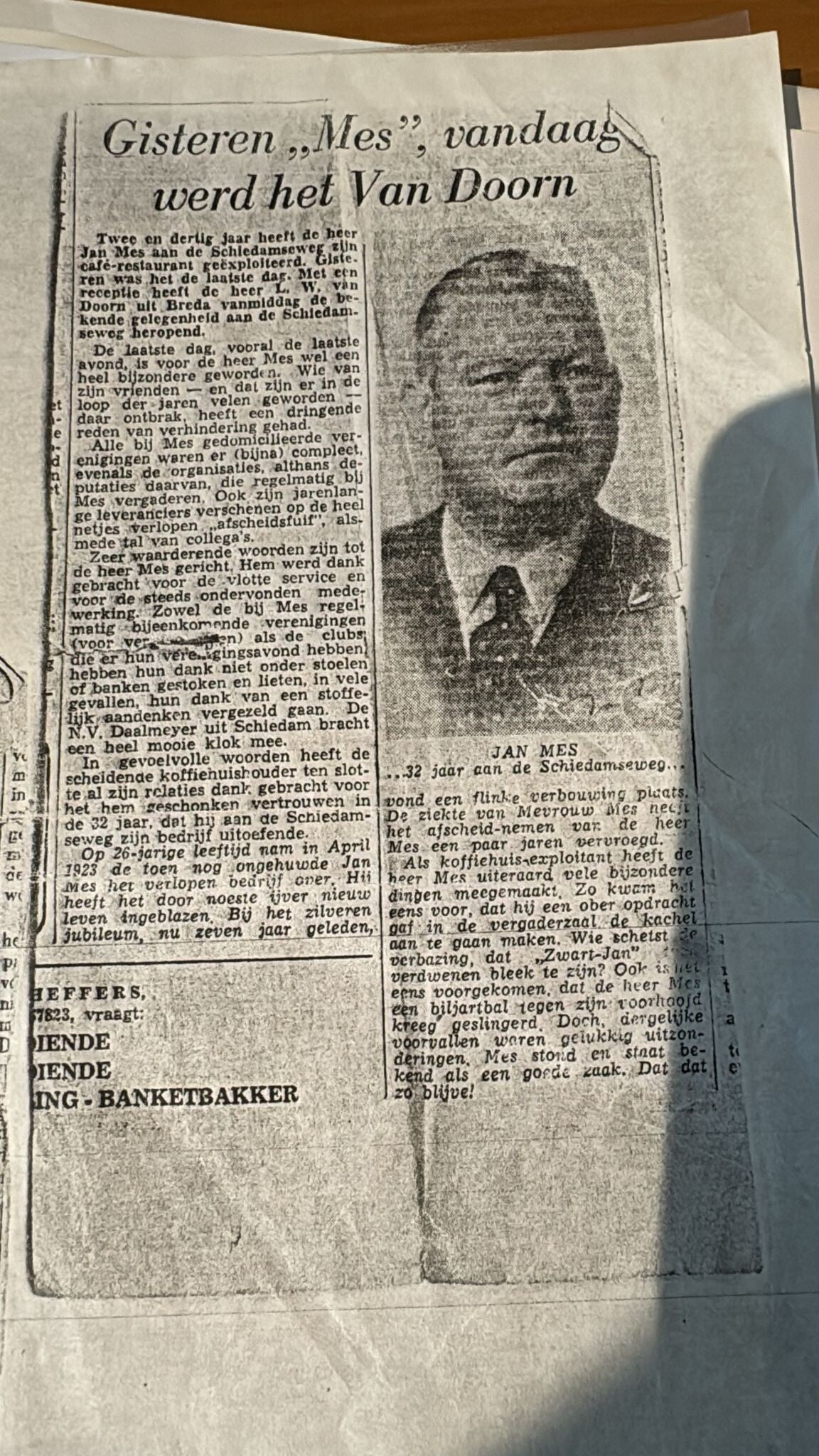 De heer Mes nam het bedrijf in april 1923 over, op 26-jarige leeftijd. Onder zijn leiding kreeg de zaak nieuw leven ingeblazen. Bij het zilveren jubileum, zeven jaar geleden, vond nog een grote verbouwing plaats. Door de ziekte van mevrouw Mes besloot hij het bedrijf nu wat eerder over te dragen.